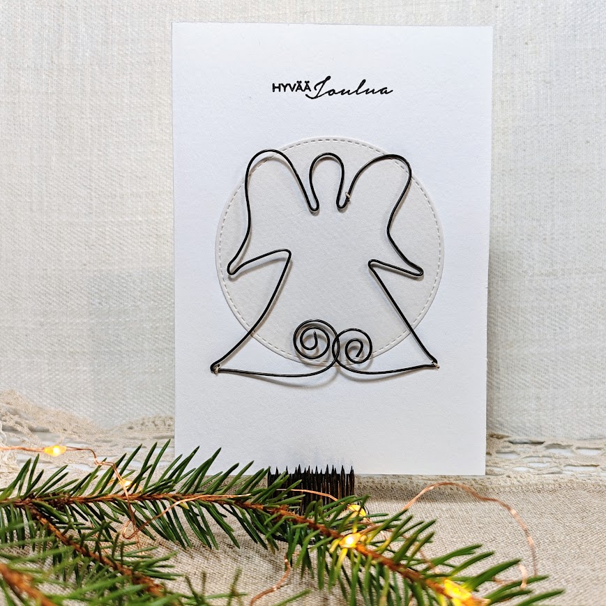 Käsintehty joulukortti, jossa on koristeena rautalangasta muotoiltu enkeli. Rautalankakortti on persoonallinen joulutervehdys kenelle vaan! Tumma rautalanka tuo korttiin rustiikkista ja romuromanttista joulutunnelmaa.