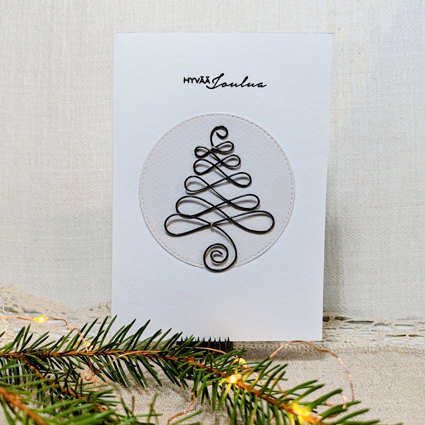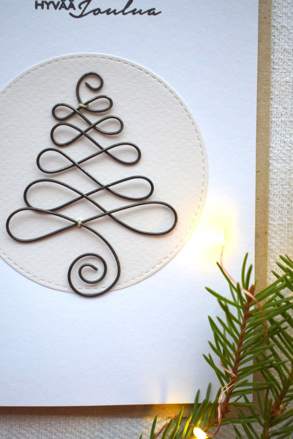 Käsintehty joulukortti, jossa on koristeena rautalangasta muotoiltu joulukuusi. Rautalankakortti on persoonallinen joulutervehdys kenelle vaan! Tumma rautalanka tuo korttiin rustiikkista ja romuromanttista joulutunnelmaa.