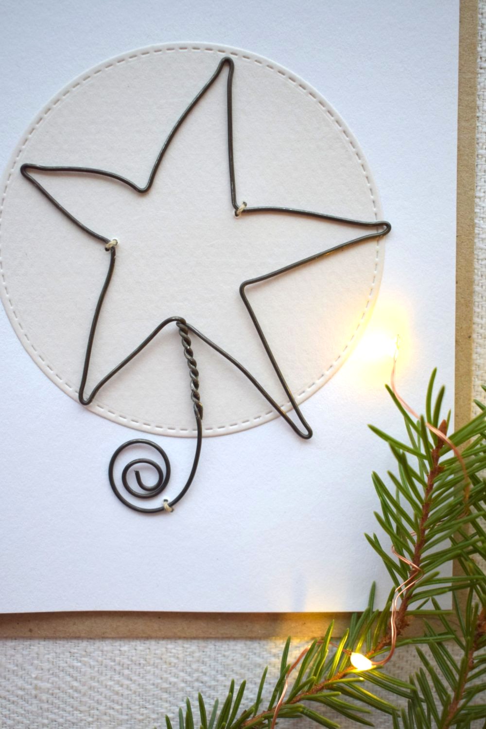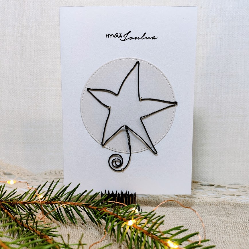 Käsintehty joulukortti, jossa on koristeena rautalangasta muotoiltu tähti. Rautalankakortti on persoonallinen joulutervehdys kenelle vaan! Tumma rautalanka tuo korttiin rustiikkista ja romuromanttista joulutunnelmaa.