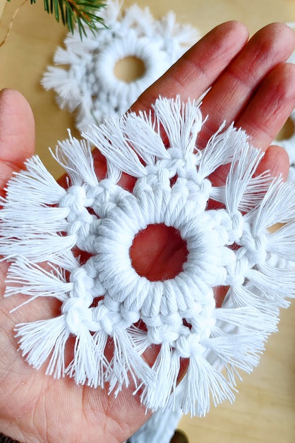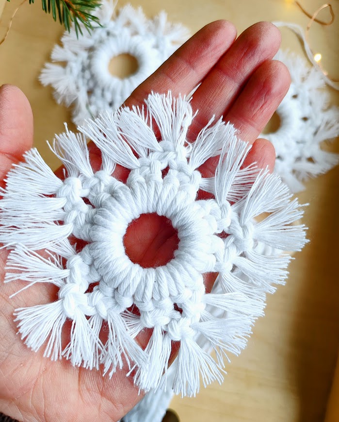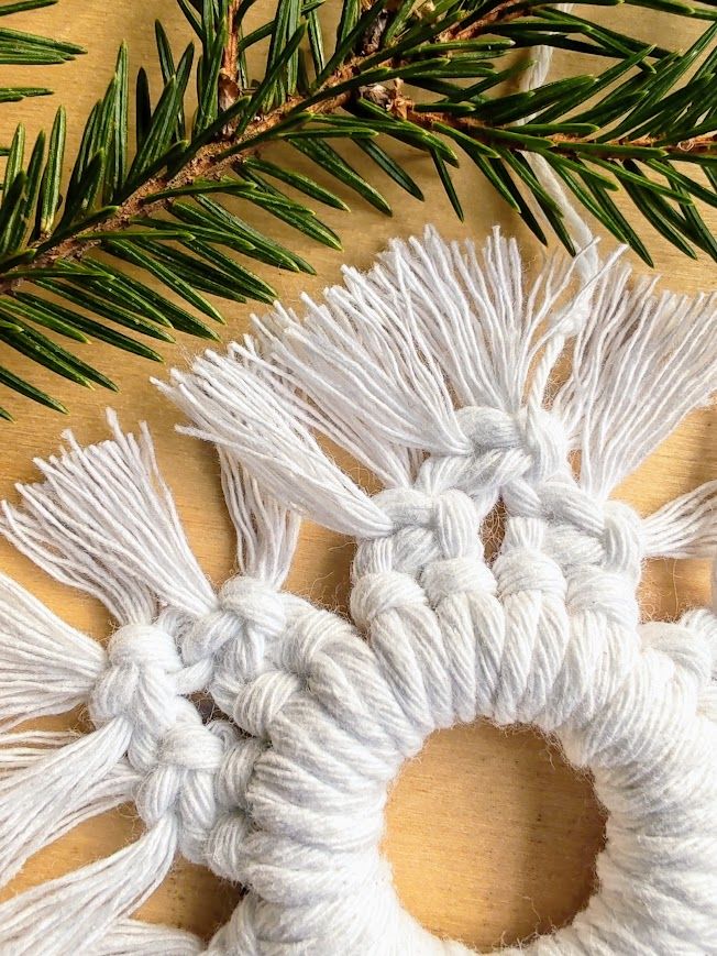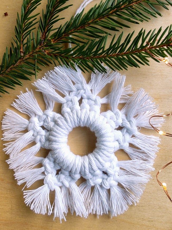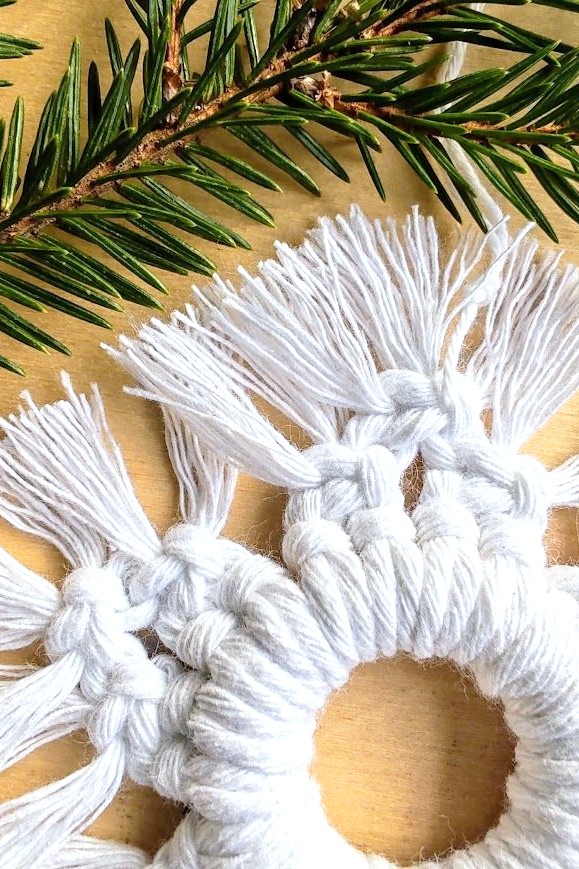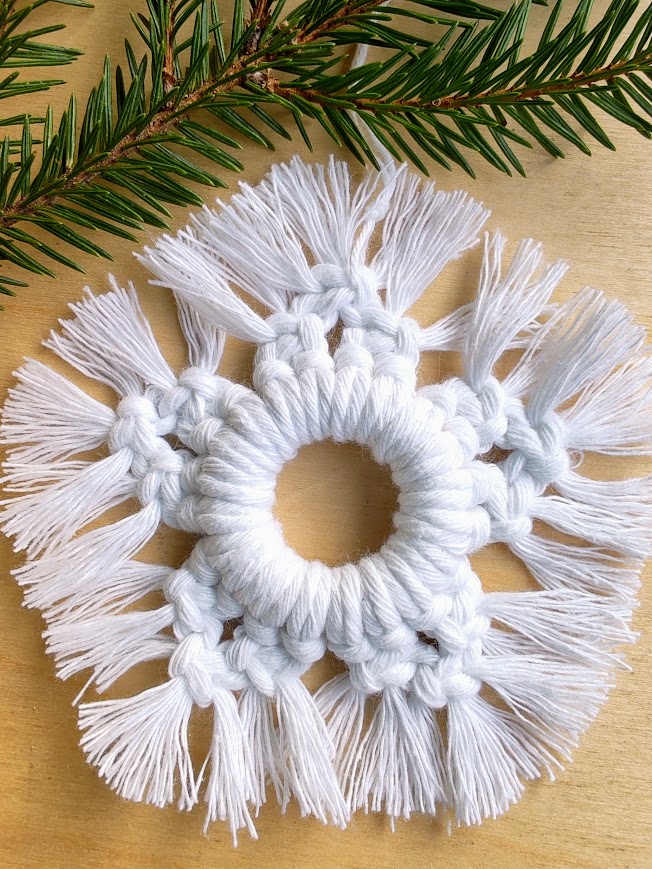 Joulukuusen koriste, joka on käsin solmittu makramee-tekniikalla. Tämä käsintehty kuusenkoriste on kiva antaa vaikka lahjaksi!