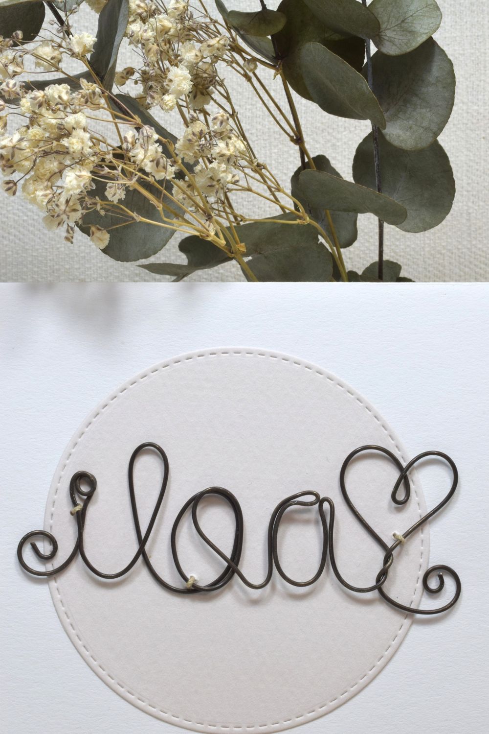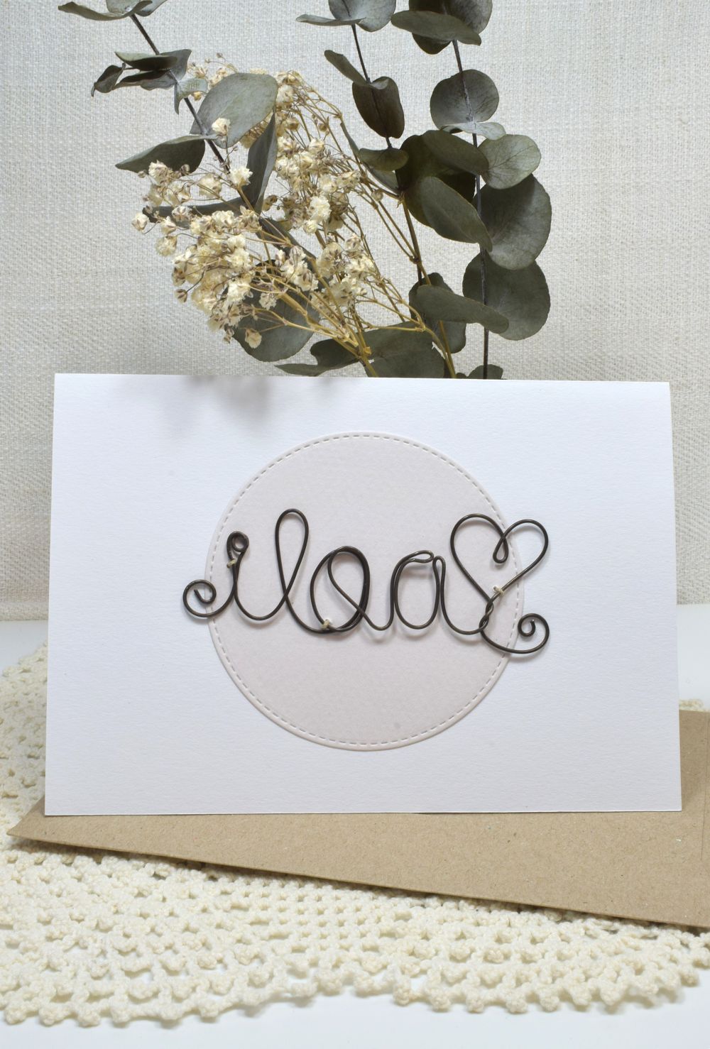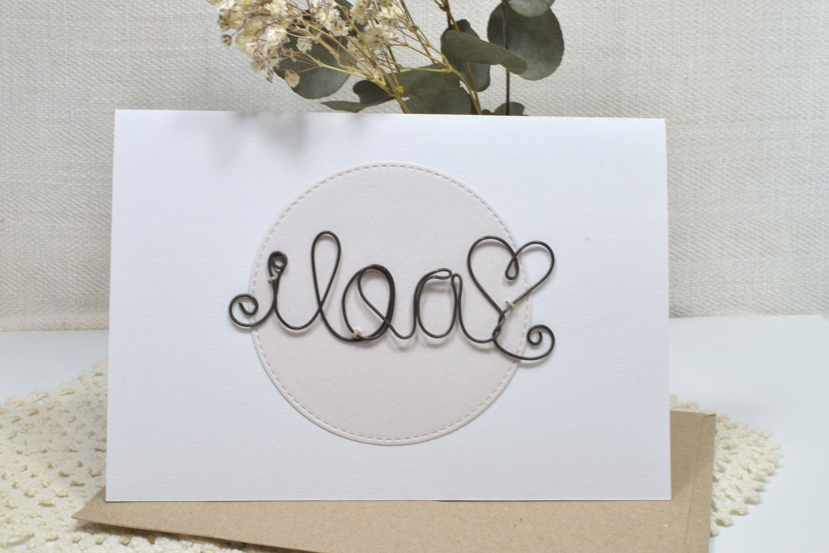 rustiikkinen rautalanka yhdistettynä vaaleaan korttipohjaan tekee