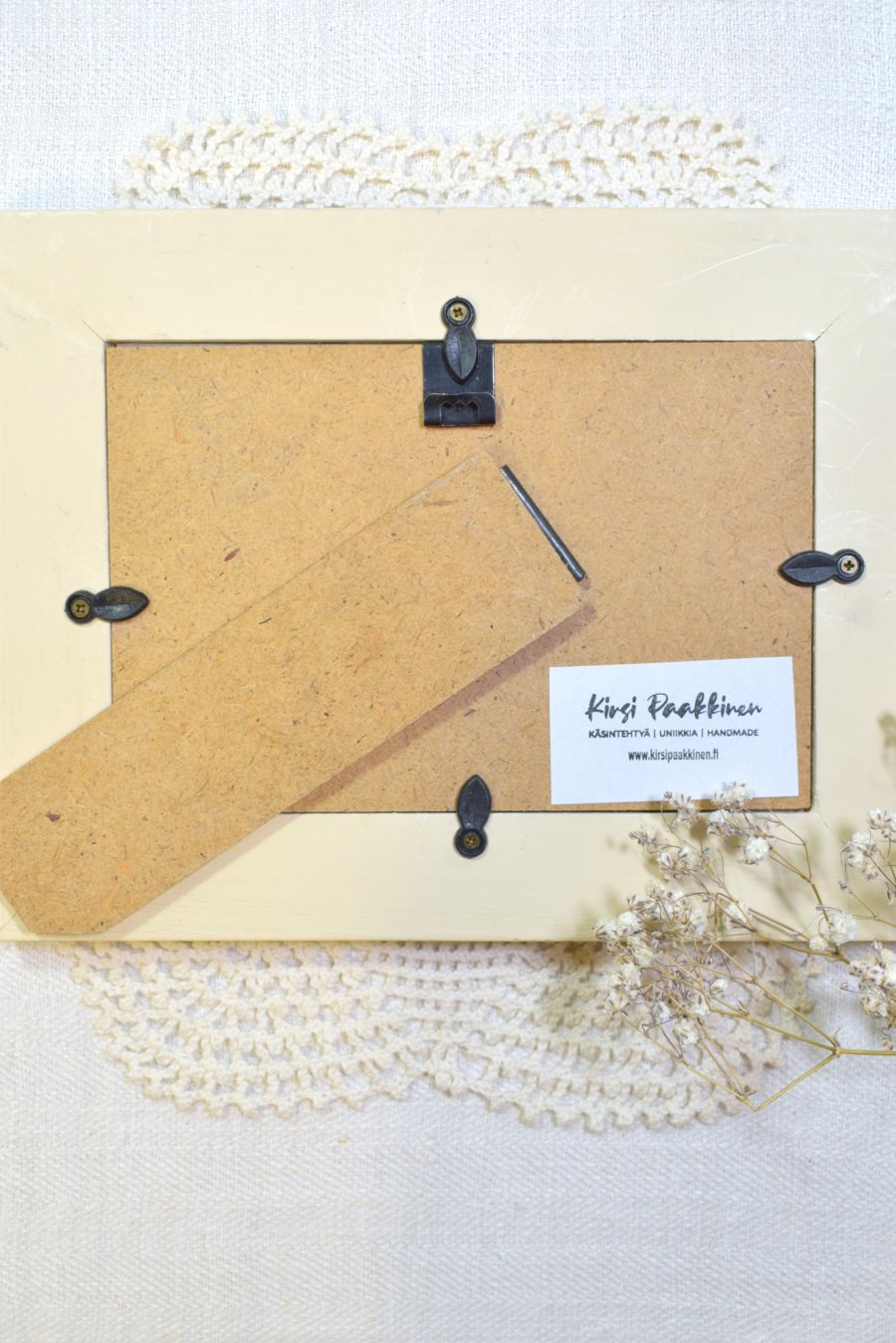 on 15,9 x 21 cm. Takana ripustuslanka ja myös tuki, jolla se pysyy pystyssä pöydälläkin.